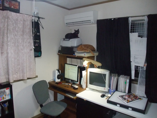 撮るために片付けた訳じゃないですよ!左の机の下にはペットボトルの山がある。